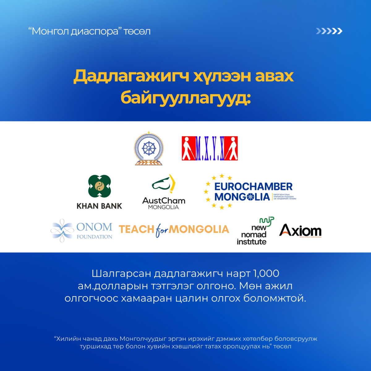 Танилуудтай болох: Ялангуяа “Монгол диаспора”-гаар дамжуулан дадлагаа хийх нь 1,000 ам.долларын тэтгэлэгтэй тул дэлхийн хаанаас ч ирсэн бай наад зах нь онгоцны тасалбараа авчхаж хүрэх нь байна. Дадлага хийнгээ зуны амралтаа эх орондоо өнгөрөөгөөд буцаж болно оо гэсэн үг. Мөн уг төслийн хүрээнд оролцогч нарын дунд зохион байгуулах уулзалт, сургалт нь танилын хүрээгээ тэлэх таатай боломж байх нь ойлгомжтой.