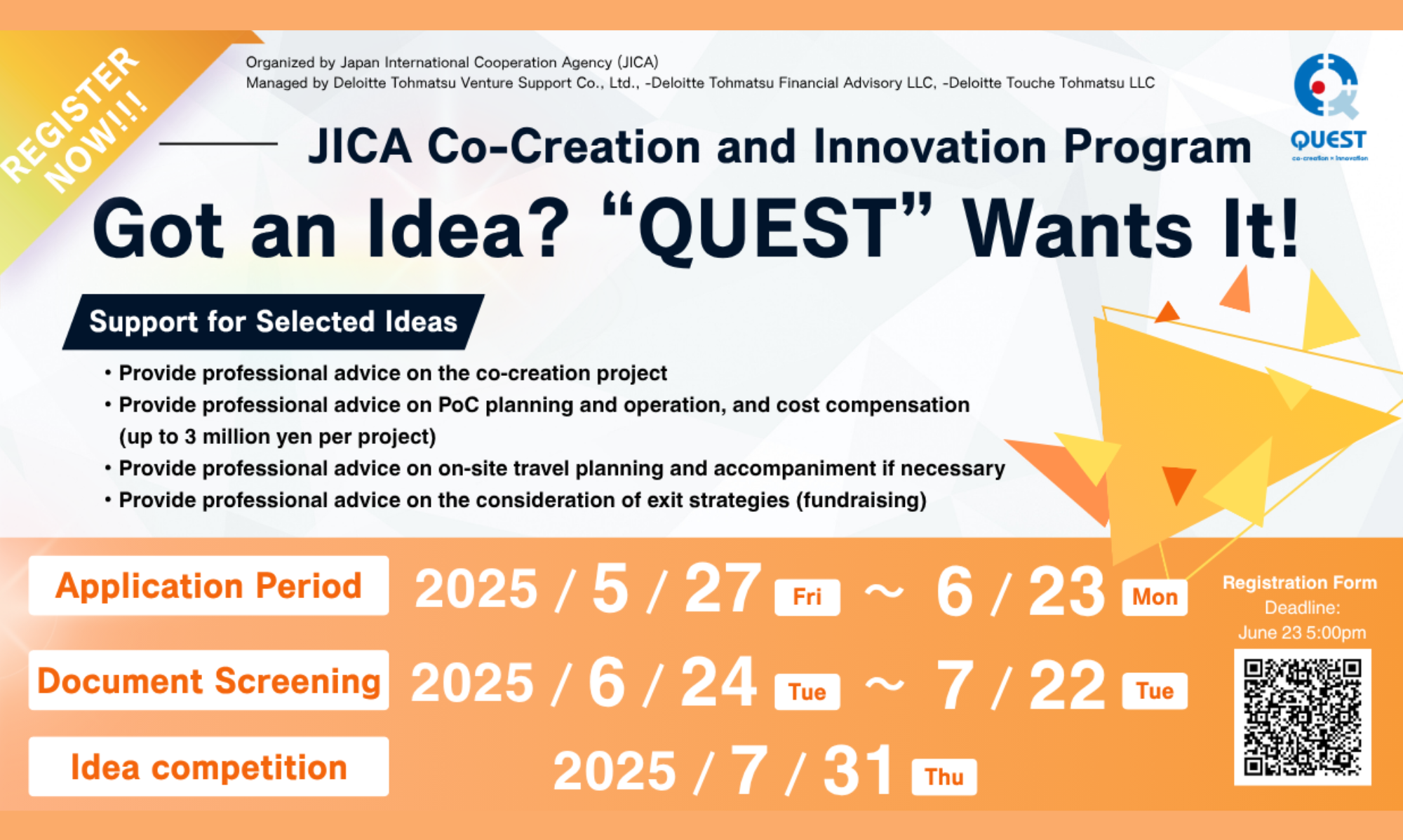 In this article, we introduce the “QUEST: Co-Creation × Innovation” program, initiated by the Japan International Cooperation Agency (JICA). QUEST is actively seeking joint initiatives, creative business ideas, and innovative projects that offer collaborative solutions to social issues.