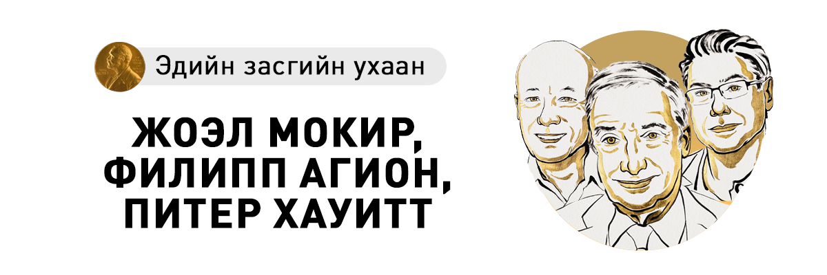 Энэ жил Жоэл Мокир, Филипп Агион, Питер Хауитт нар Эдийн засгийн ухааны Нобелийн шагналыг хүртлээ. "Хүн төрөлхтөн сүүлийн хоёр зуун жилд анх удаа эдийн засгийн тасралтгүй өсөлт үзүүлээд буй бөгөөд энэ нь асар олон хүнийг ядуурлаас гаргаж байгаа хэрэг билээ. Харин энэ жилийн Нобелийн Эдийн засгийн шагналыг хүртэж буй эрхэм Жоэл Мокир, Филипп Агион, Питер Хауитт нар нь инновац эл өсөлтийг хэрхэн улам цааш ахиулж болох арга замыг тайллаа" хэмээн Нобелийн шагналын хэвлэлийн мэдээнд онцолсон байв.