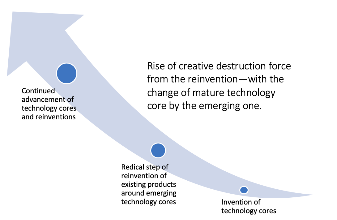 Харин дээр өгүүлсэн “Creative Destruction” гэх математик моделийг тун энгийнээр тайлбарлавал аливаа компани зах зээлд бүтээлч байдлаар инновацлаг бараа бүтээгдэхүүн, үйлчилгээ нэвтрүүлэх үед тухайн инновацаас хоцрогдолтой бараа бүтээгдэхүүн, үйлчилгээ зах зээлээс түлхэгдэнэ. Энэ утгаараа шинэ инновац зах зээлд гарах бүр хуучин бүтээгдэхүүн, үйлчилгээг бүтээлч байдлаар үгүй хийдэг гэж ойлгож болно. Уг асуудлын цаадах механизмыг профессор Питер Хауитт, Филипп Агион нар тайлбарласан нь эл салбар дахь хамгийн том шагналыг хүртэхэд чухал нөлөө үзүүлсэн байна.