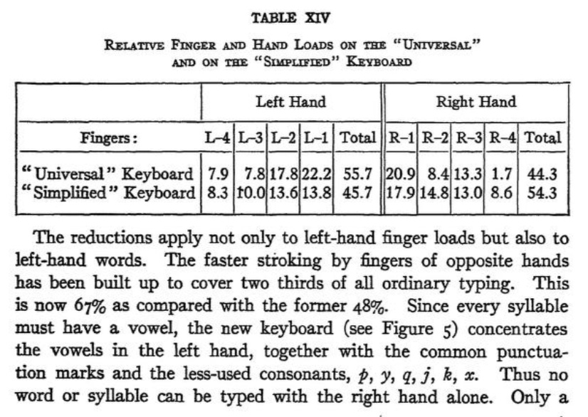 Уг номд тайлбарласнаар QWERTY кэйборд зүүн гард 56 хувийн ачаалал өгч буй нь үр бүтээмжид сөргөөр нөлөөлөхүйц загвар аж. Учир нь ихэнх хүмүүс зүүн гар бус баруун гараа илүү ашигладаг шүү дээ. Оронд нь зүүн гард ирэх ачааллыг тэнцвэржүүлж, баруун гарт яльгүй их ачаалал өгсөн нь зөв шийдэл гэжээ.