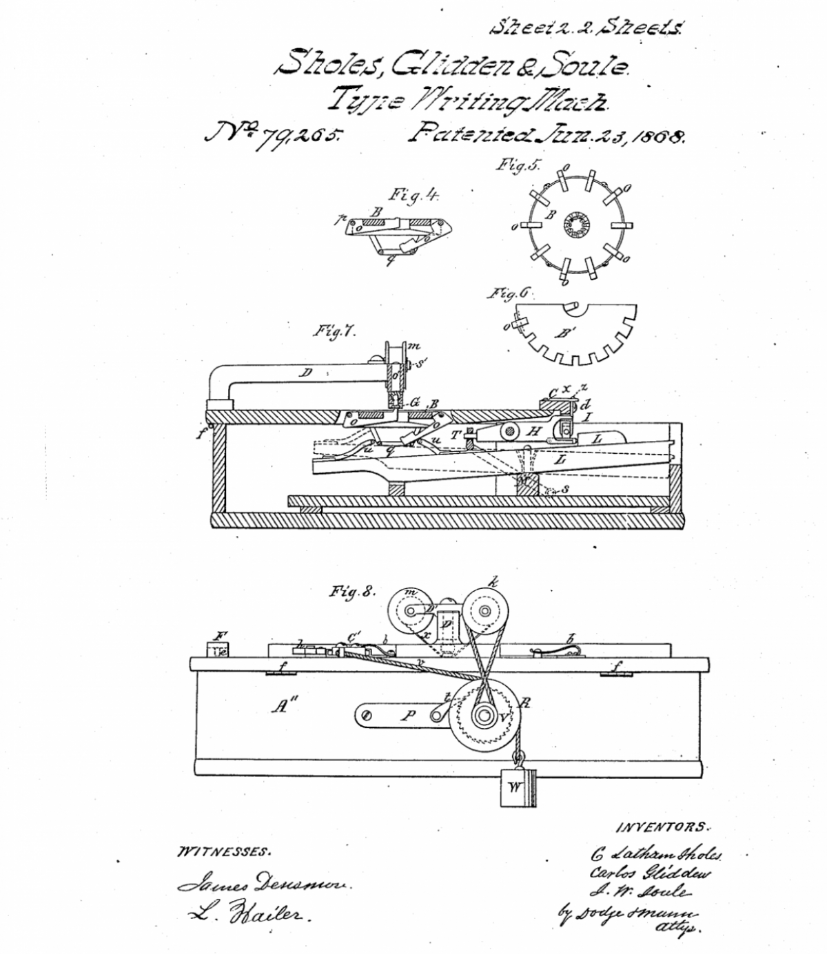 Тэгвэл энэ төгөлдөр хуурын мэт зохион байгуулалтыг Шоулс ч өөрийн хамтрагч Глидден, Соулес нарын хамт дахин дуурайж, өөрсдийн зохион бүтээсэн анхны “хэрэглээнд нийцтэй” бичгийн машиныг 1868 онд патентлуулжээ.