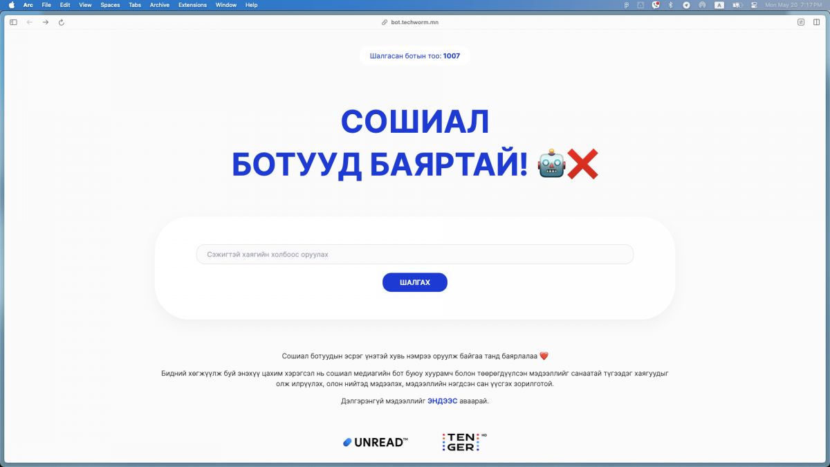 Олон нийтийн сүлжээн дэх бот хаягуудыг олж илрүүлэх, энэ талаарх сонгогчдын боловсролыг нэмэгдүүлэх зорилгоор Unread-ийн редакц, Tenger TV-тэй хамтран “Бот шалгагч” вебийг бүтээлээ. Энэхүү вебийн ажиллах зарчим тун энгийн.