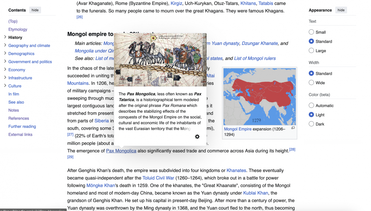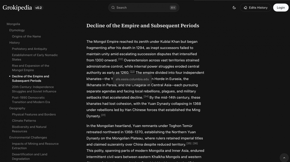 Харин зүүн талд нь нийтлэлийн бүлгүүдийг жагсаасан нь Britannica, Oxford Research Encyclopedias зэрэг ихэнх цахим нэвтэрхий толиудын жишиг (Grok ч мөн адил) билээ. Түүнчлэн, олон өнгийн диаграмм, график, хүснэгтээр баялаг нь дан текст уншихаас илүү амар бөгөөд ойлгомжтой байсныг дурдууштай. Мөн мэдээж ихэнх нийтлэлийг унших явцад ойлгомжгүй нэр томьёо, агуулга гарч ирвэл Wikipedia-гийн бусад бичвэрээс дэлгэрүүлж унших боломжийг олгодог цэнхэр өнгийн холбооснуудыг дурдалгүй өнгөрч болохгүй.