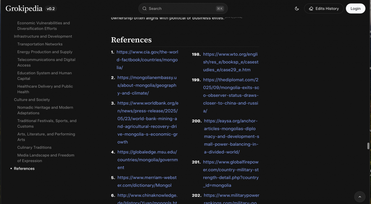 Grok: Wikipedia-тай яг ижил сэдэвтэй нийтлэлд Grok нийт 386 эх сурвалжаас эшилсэн байна. Тэгэхдээ мөн л Wikipedia-гийн адил баталгаатайгаас баталгаа сул эх сурвалжуудыг хооронд нь ялгаж салгалгүй нэгтгэжээ. Тухайлбал, МУ-ын тухай нийтлэлд Монцамэ агентлагийн нийтлэлээс энгийн X (Twitter)-ийн хэрэглэгчийн жиргээг хүртэл эх сурвалждаа ашигласан байх жишээтэй. Гэхдээ Wikipedia-гаас ялгаатай нь дан цахимаас шууд унших боломжтой эх сурвалжуудыг холбосон нь байв.