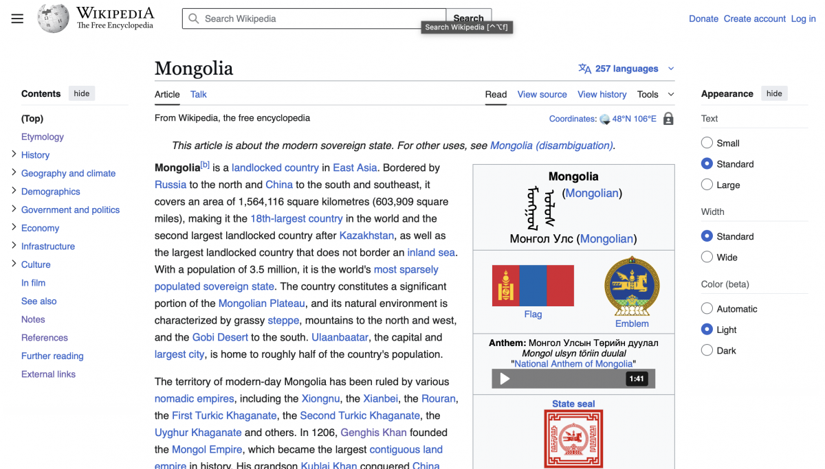 Wiki: Нийтлэл эхэндээ хүн амын тоо, газар нутгийн хэмжээ, газар зүйн байршил болон дундад зуунаас өдий хүртэлх товч түүх зэрэг ерөнхий мэдээллийг хамруулсан байв. Түүнээс гадна, нийтлэлийн баруун талд Wiki-гийн сонгодог загвараар баганан хүснэгтэд Монгол Улстай холбоотой тоо баримт, газрын зураг, төрийн далбаа, дуулал, мөнгөн дэвсгэрт, цагийн бүс, ДНБ, одоогийн төрийн удирдлагуудыг багтаажээ.