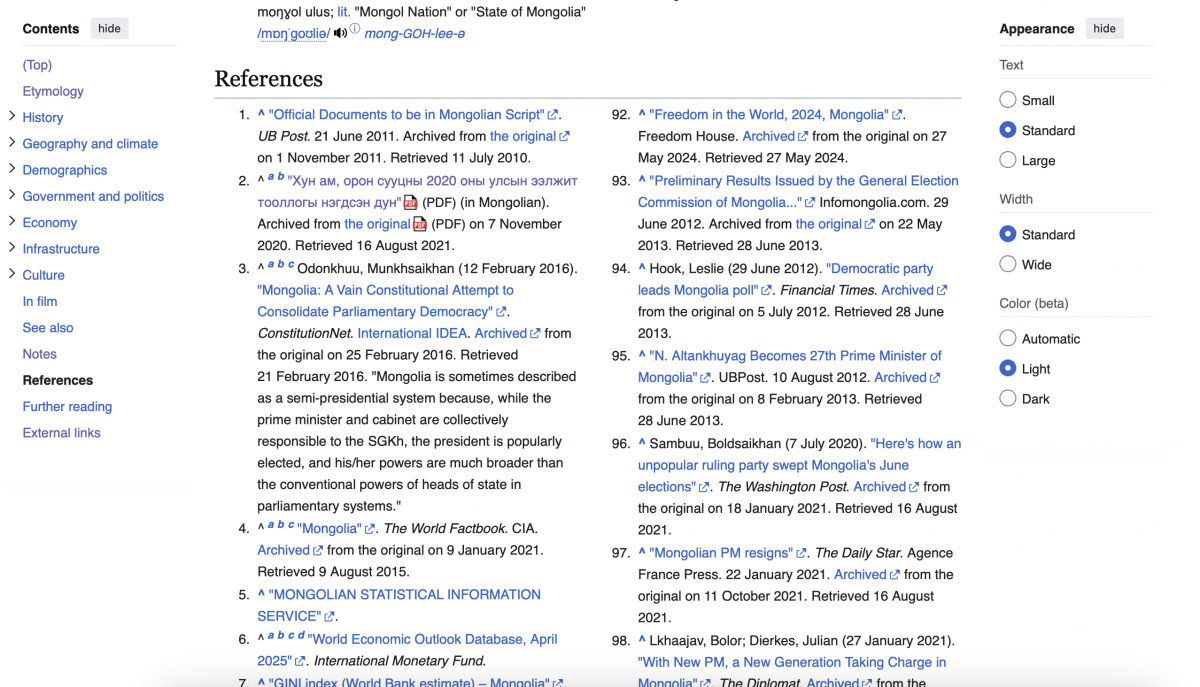 Wiki: Wiki-гийн хувьд хүн амын тоог 2023 оны байдлаар 3,504,741 хэмээсэн нь үнэн боловч хамгийн сүүлийн үеийн буюу Үндэсний статистикийн хорооноос гаргасан 2024 оны тоо баримтаар шинэчлээгүй байв. ДНБ-ий тухайд энэ оны байдлаар 73.280 тэрбум доллар хэмээжээ. Харин хэдийгээр “Монгол” хэмээх нэрийн үүслийн талаар (etymology) “тодорхойгүй” гэсэн байсан ч дараах таамгийг хуваалцжээ. Тухайлбал, Wiki-д бичсэнээр “Mongolia” гэх нэр нь латин хэлээр “Монголчуудын нутаг” гэх утга бүхий үг хэмээн тайлбарласан байх бөгөөд Францын түүхч Этьен де ла Вассьерийн таамаг болох “IV зууны Жужаны үндэслэгчийн Мугулү нэрээс гаралтай гэж үздэг” гэснийг хавсаргасан байлаа.