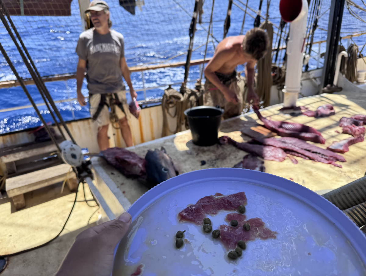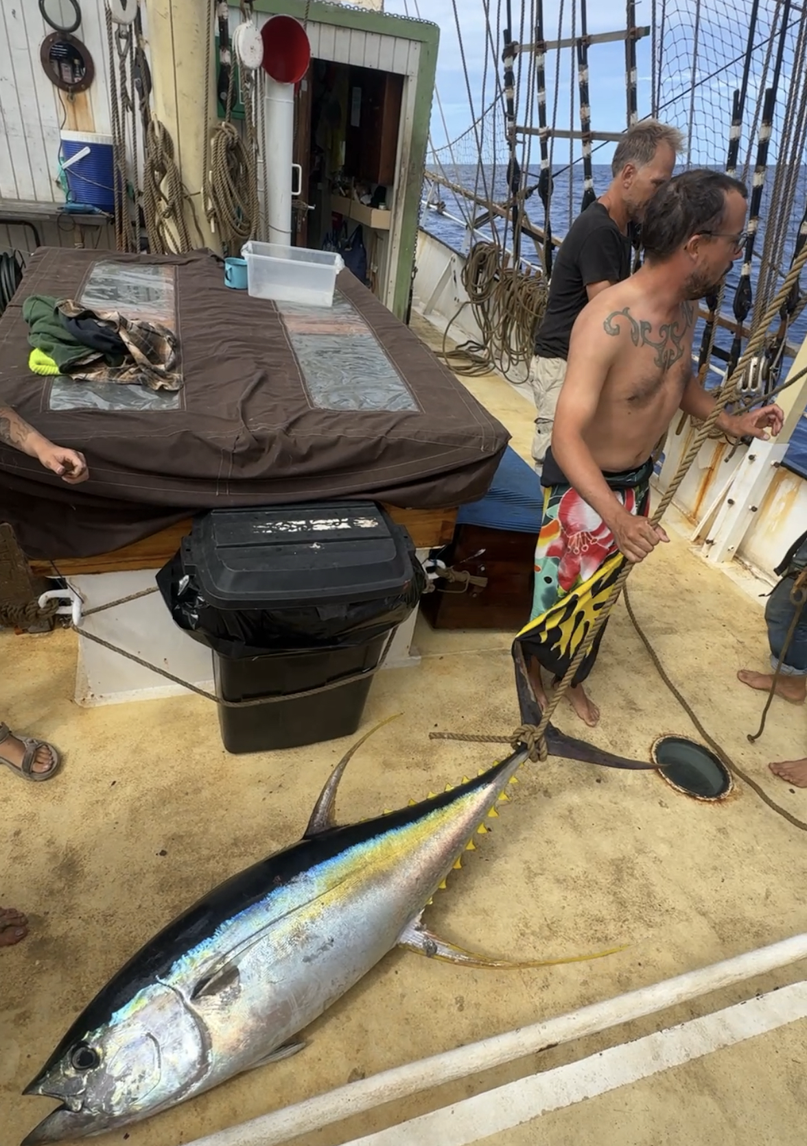 Дээр хүмүүсийн орилолдох дуунаар сэрлээ. Загасны уургад том загас орсон гэнэ. Ийнхүү дарвуулаа салхи өөд харуулж завиа зогсоогоод, уургаа эргүүлсээр бараг хоёр цаг оролдсоны эцэст том шар сэрвээтэй туна загас гарч ирснийг дөрвүүл татаж, арай хийн уснаас гаргахдаа баярлан зургаа авхуулцгаалаа. Энэ аялал эхэлснээс хойш барьсан хамгийн том загас. Бараг 70кг давсан том загас байсан шүү.