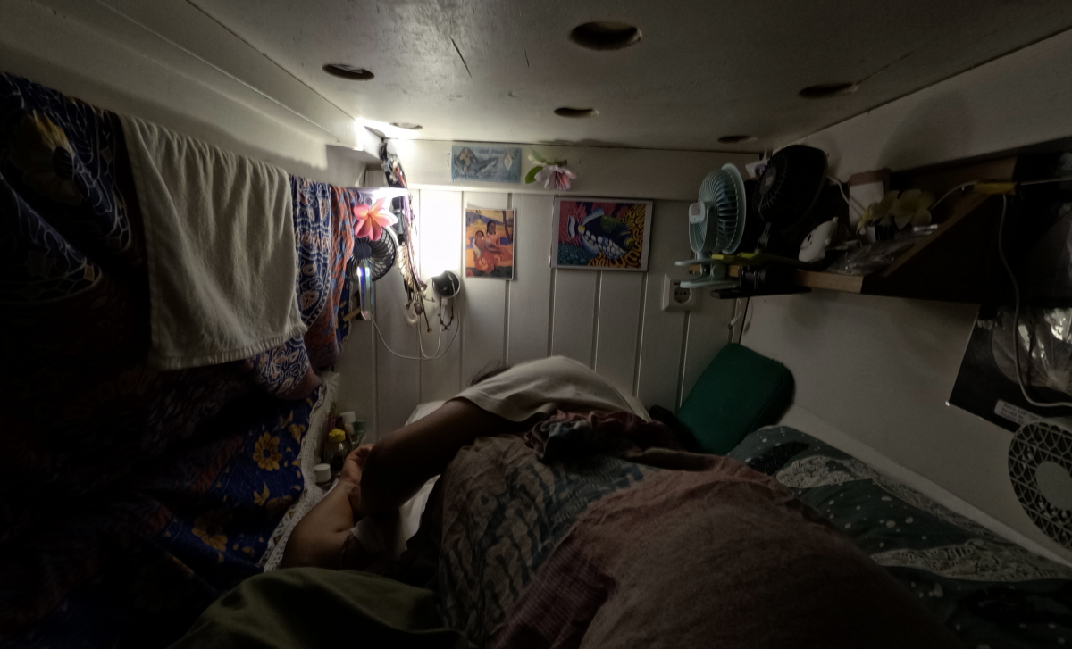 Энэ миний ор. Өөрөөр бол энэ завин дээрх ганц хувийн орон зай маань. Завь байнга савлаж хөдөлдөг тул би хоёр талдаа дэр тавьж унтдаг. Манай хөлөг онгоц уламжлалт аргаар дарвуул ашиглан явдаг учраас хийх ажил дуусахгүй. Иймдээ ч аяллын багийнхан гурван ээлжээр нэг удаад дөрвөн цагаар ажилладаг. Харин би одоо өөрийн хуваарилагдсан ээлжид гарахдаа бэлдэж байна. Ийнхүү шөнө 00:00-04:00, өдөр 12:00-16:00 цагийн хооронд ажиллах хэрэг.