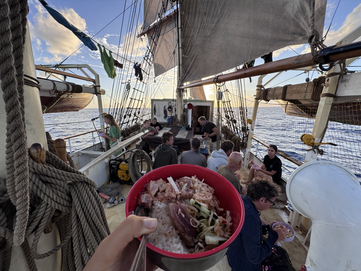 Бид өчигдөр Тонга хаант улсын Вава'у арлаас хөдлөхдөө жимс ногоо авсан. Урт аяллуудад эхний долоо хоногт жимс, удаах долоо хоногт ногоо дуусчихдаг. Тийнхүү үр тариа, шош, гоймон, будаа зэрэг удаан хадгалах боломжтой хүнс голдуу хэрэглэдэг тул жимс ногоог тун их санадаг. Чухам эх газар, арал дээр очихдоо л төрөл бүрийн амттан идэж баярлацгаана.