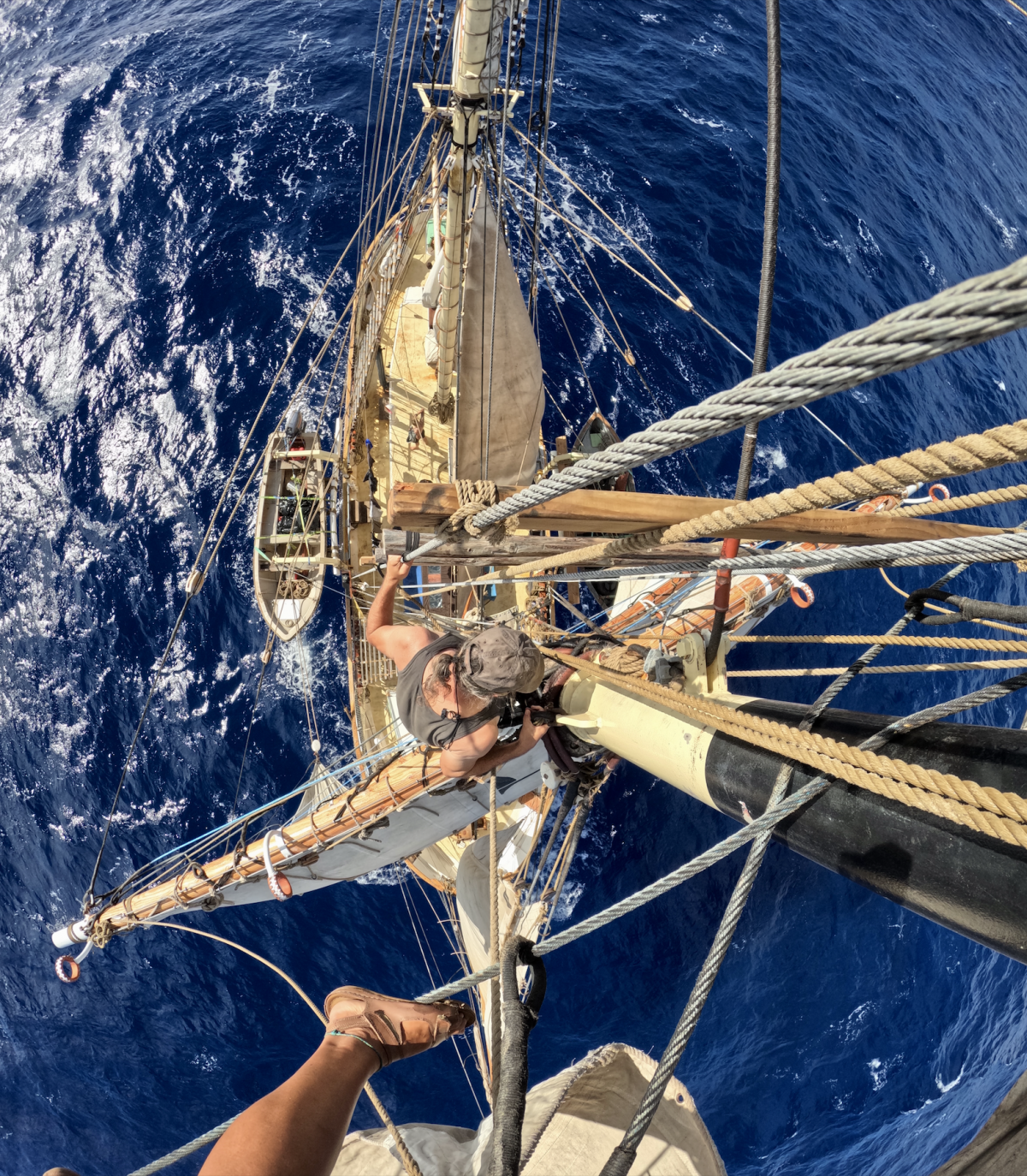Завины хамгийн дээр байдаг дарвуулын оёо нь задарчхаж. Дээш гарч дарвуулаа салган буулгаж, ирэх хэдэн хоног ээлж ээлжээр оёж засах шаардлага гарлаа. Яг одоо миний зогсож байгаа хэсэг завины тавцангаас 18 метрийн өндөрт байрладаг. Завины савлах хөдөлгөөн энд улам илүү мэдрэгддэг тул өндрөөс айдаг хүмүүс энд гарч ирэхэд анх их хэцүү байдаг.