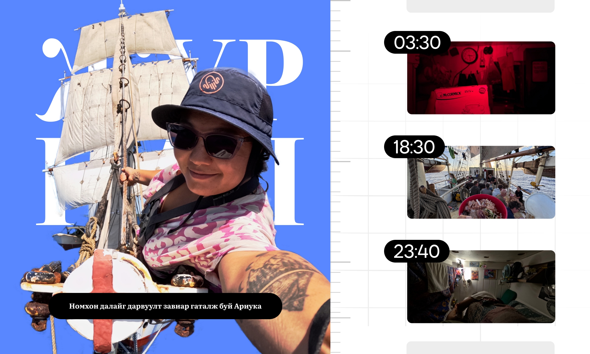 Журналын эзэн Ариунсанаа нь Дани улсын “Нептун” нэртэй бригантин хөлөг онгоцоор Номхон далайг гатлах аяллын багийн гишүүн бөгөөд далайд гараад 135 дахь хоногоо үдэж буй.