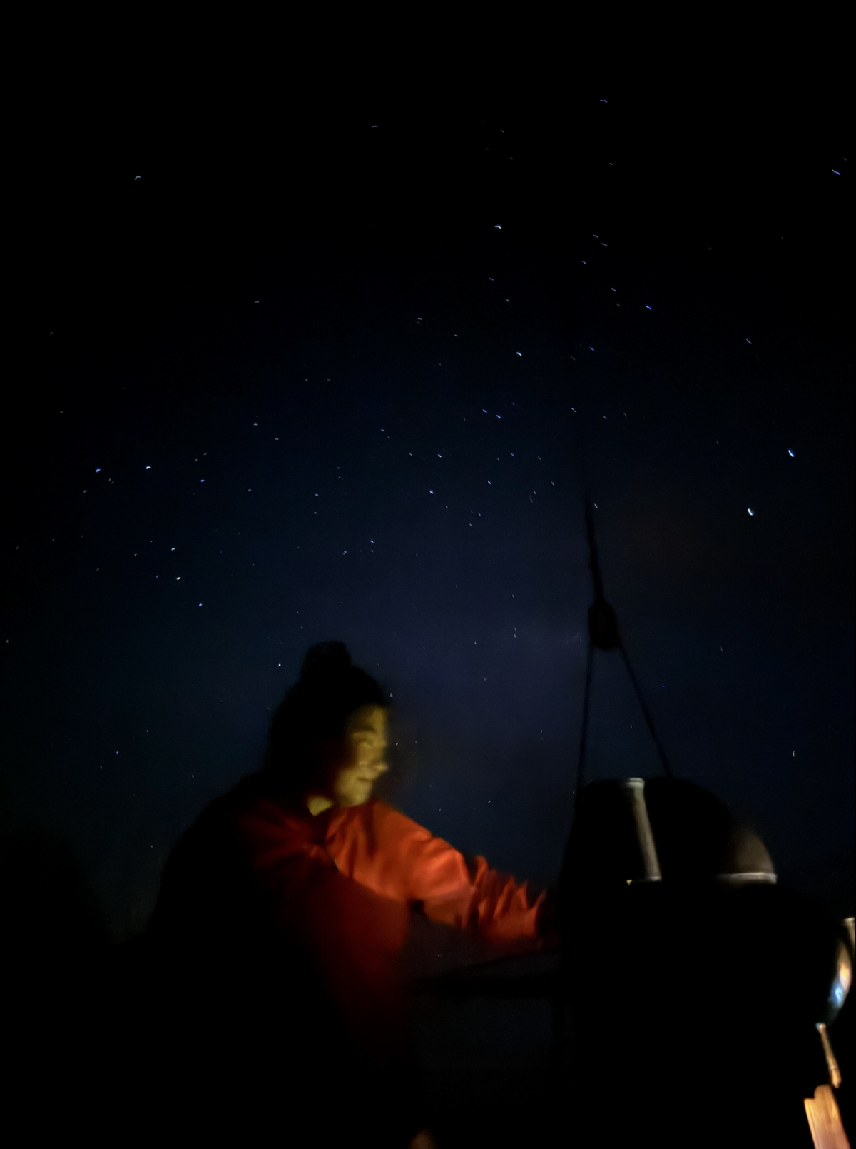 Энд шөнийн тэнгэр Монголд харагддагаас тун ондоо. Сонирхуулахад, экватор гаталснаас хойш Maui’s hook буюу Хилэнцийн ордны одод харагдаж эхэлсэн. Заримдаа үүлгүй шөнө оддыг ашиглан хөлгөө залж суух их гоё. Номхон далайгаар тархан суурьшсан Полинез далайчдын хувьд хилэнцийн ордны од их чухал юм билээ. Сар мандахаас өмнө далайн давлагааг гэрэлтүүлдэг Сугар гараг нүдэнд үзэгдээд амжина. Бид ихэвчлэн баруун зүгийг чиглэн явж байгаа учир завины зүүн талд Өмнөд зүгийн загалмай од ч байнга харагддаг.