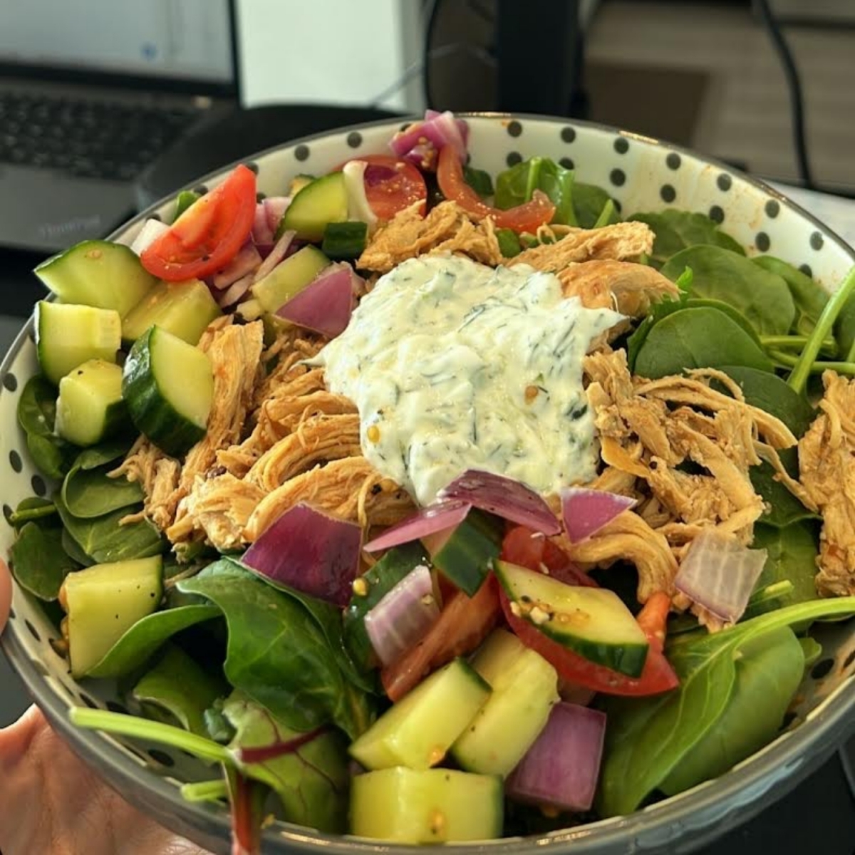 Өглөөний цай уудаггүй болохоор өдрийн хоолоо эрт идэхийг хичээдэг. Гэрээс ажиллахын нэг давуу тал нь өдрийн хоолоо тухтай хийж идэх боломж юм. Хүсвэл оройн хоолоо ч эрт бэлдэж болно. Өнөөдөр уураг, шим тэжээлээр баялаг тахианы махтай салат идэж байна. Оффисоос ажиллаж байгаа өдрүүдэд ч гэсэн гэртээ өег хоол хийгээд авч явахыг боддог.