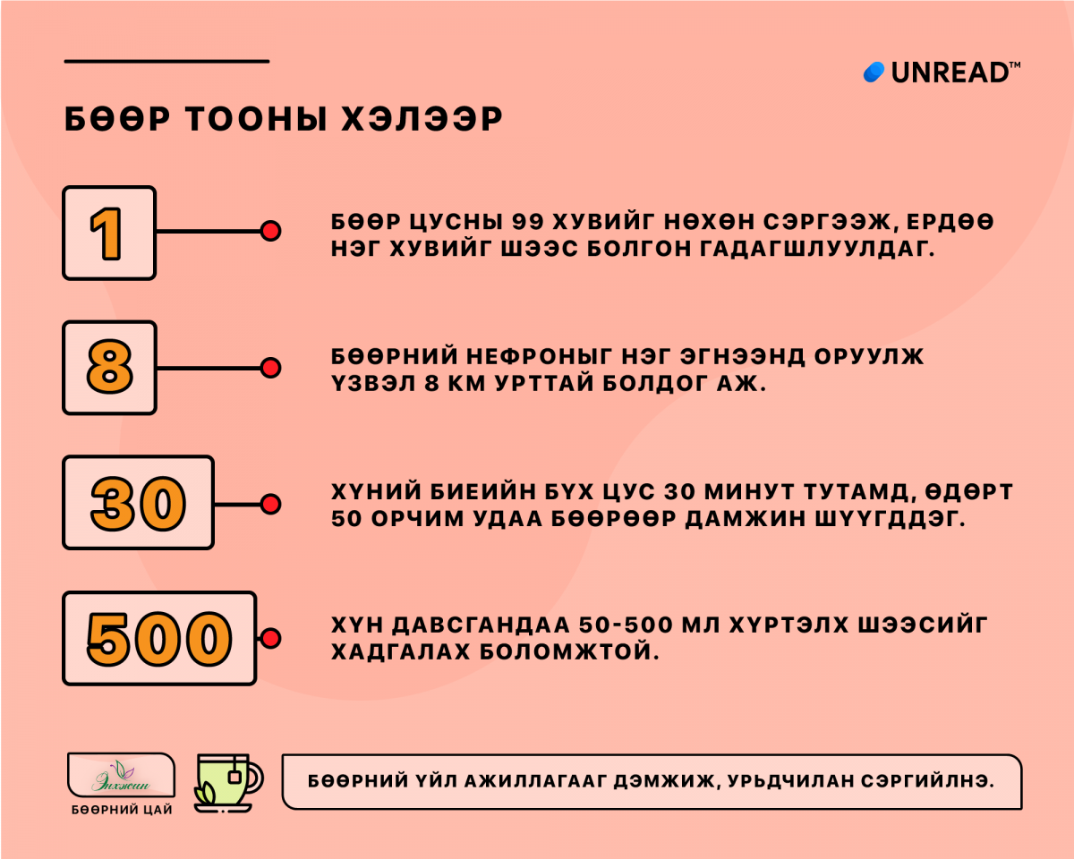 1: Бөөр цусны 99 хувийг нөхөн сэргээж, ердөө нэг хувийг нь л шээс болгон гадагшлуулдаг.