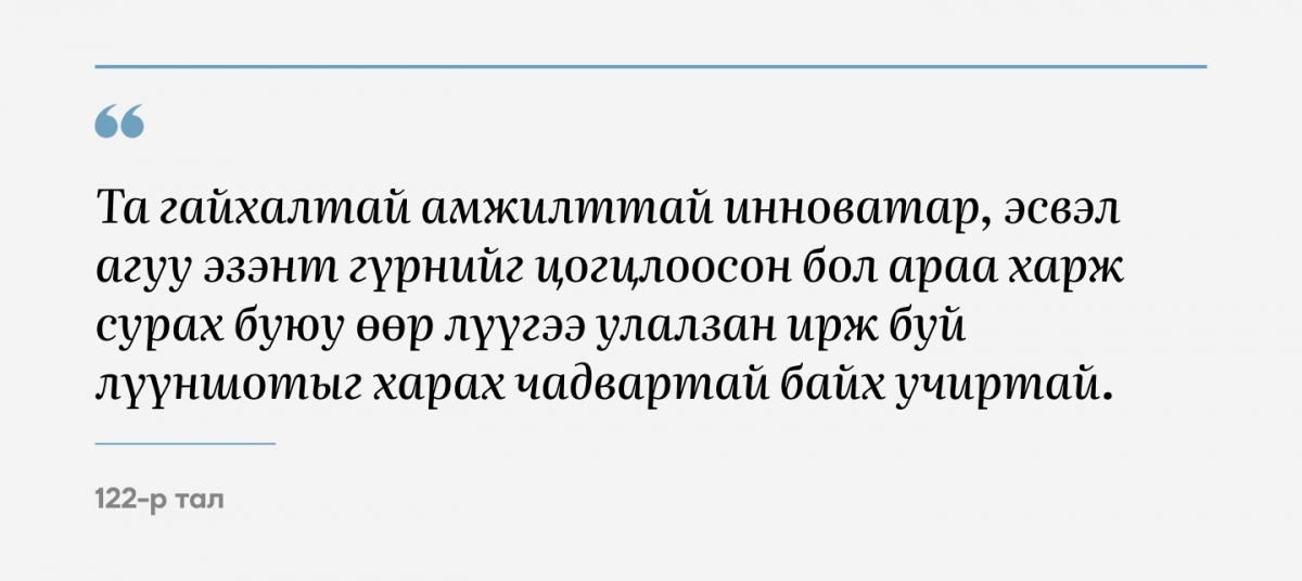 Эргэлзэгч, эрэн хайгч хэн бүхэнд өөрийнхөө гайхалтай санааг хэрэгжүүлэн түүгээрээ өнөөдрийг бас ирээдүйг өөрчлөх эрч хүч, урам зориг өгөх бүтээл мэт санагдав.