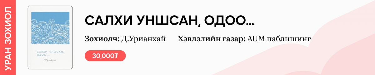 Яруу найрагч, зохиолч Д.Урианхай энэ удаагийн Номын баяраар хос бүтээлээ хэвлүүлж буй. Тэдгээрийн нэг нь зохиолчийн сүүлийн үед бичсэн гүн ухааны эргэцүүлэл болон хүмүүний мөн чанар, оршихуйн тухай “Салхи уншсан, одоо…” нэртэй өгүүллэгийн түүвэр билээ. Хэвлэлийн газрын зүгээс “Түүний өгүүллэгүүд нь хүн хоорондын харилцаа, өнөөгийн технологи давамгайлсан нийгэмд хэрхэн мөн чанараа гээлгүй "хүн хэвээр үлдэх", үнэт зүйлсээ дотоод сэтгэлдээ яахин ухамсарлах талаарх сэдвийг уудалсан” хэмээжээ.