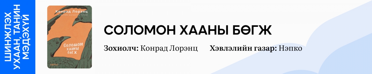 Физиологи, Анагаах ухааны салбарын Нобелийн шагналтан, этологийн шинжлэх ухааны анхдагчдын нэг Конрад Лорэнцийн бүтээл “Соломон Хааны бөгж”-ийг эх хэлээрээ унших боломжтой болжээ. Этологи нь амьтны зан үйлийг судлахад чиглэдэг ба тэртээх 1949 онд зохиолч эл номдоо тус шинжлэх ухааныг тун ойлгомжтой, энгийн хэллэгээр буулган хүргэсэн гэдгээрээ олонд танигдсан аж. Түүнчлэн амьтан ба хүний араншны холбоо, зангилааг философийн өнгө аястай хоршуулан тайлбарласныг онцлууштай.