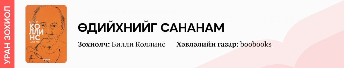 Америкийн яруу найрагч Билли Коллинсийн шүлгүүдээс сорчлон сонгож, boobooks-ээс орчуулан хэвлүүлжээ. Тэдний дурдсанаар, "Орчин цагийн яруу найргийн ертөнцөд хэн нь ч Билли Коллинс (1941) шиг олонд танигдаагүй, түүнийх шиг хэмжээний алдар нэрийн оргилд хүрээгүй гэхэд хилсдэхгүй. Түүний оролцох яруу найргийн уншлагын тасалбар хэдэн мянгаараа зарагдаж, хэвлэлийн газрууд шинээр хэвлэгдэх түүвэрт нь зургаан оронтой тоогоор хэмжигдэх урьдчилгаа өгдөг байсан нь саяхан. Өдгөө 80 хэдийнээ гарсан ч долоо хоног бүр цахимаар уншлага хийхэд нь хэдэн арван мянган хүн түүнийг шууд сонсдог нь хэвээрээ байна" гэсэн нь зохиолч нэр хүндийг бэлхнээ харуулж байгаа болов уу.