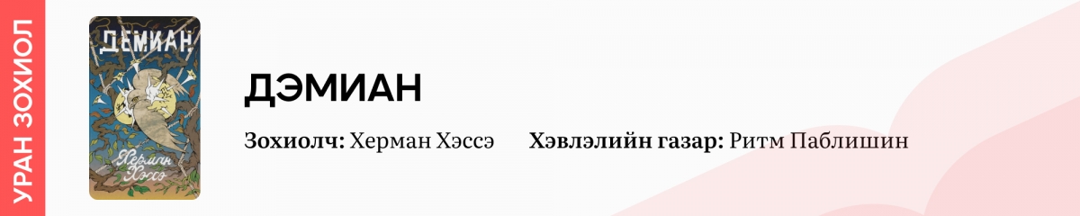 1946 онд Нобелийн Утга зохиолын шагнал хүртэж байсан зохиолч Херманн Хэссэг бид "Талын чоно", "Сиддхарта" зэрэг романуудаар нь илүүтэй мэдэх болов уу. Энэ удаагийн Номын баяраар Ритм Паблишингийн зүгээс түүний "Демиан" гэх зохиолыг орчуулан хэвлэж байгаа юм. Зохиолч 1917 онд Эмил Синклер гэх хуурмаг нэрээр “Демиан” романаа гаргасан байна. Ритм Паблишингийн тодорхойлсноор “Демиан бол зохиолчийн өөрөө өөрийгөө харгалзан хорьсон бас өөрөө өөрөөсөө чөлөөлөгдөн мултарсан өнө удаан үйл явцын баримт нотолгоо болсон роман" аж.