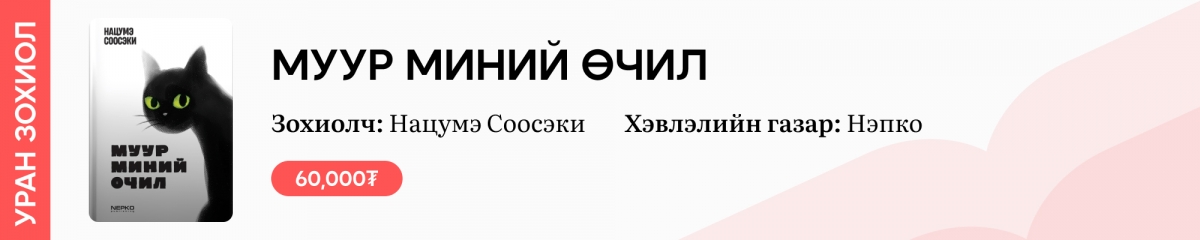 Анх 2002 онд эх хэлнээ орчуулагдаж байсан “Муур миний өчил” романыг өнгөрсөн сард Нэпко хэвлэлийн газраас дахин орчуулан хэвлэжээ. Тус номын зохиолч Нацумэ Соосэкигийн хувьд Японы реалист романы сонгодог төлөөлөгчдийн нэг гэгддэг бөгөөд Боччан, Санширо, Кокоро тэргүүтэй олон бүтээлээрээ алдартай нэгэн. Түүний хамгийн анх гаргасан номуудын нэг нь “Муур миний өчил” хэмээх энэхүү бүтээл бөгөөд шинэчлэгдэн өөрчлөгдөж байгаа Япон Улс, тус улсын түмнийг муурын нүдээр ажиглан харж, шүүн тунгааж буйгаар өгүүлдэг, хошин, егөөтэй зохиол юм.