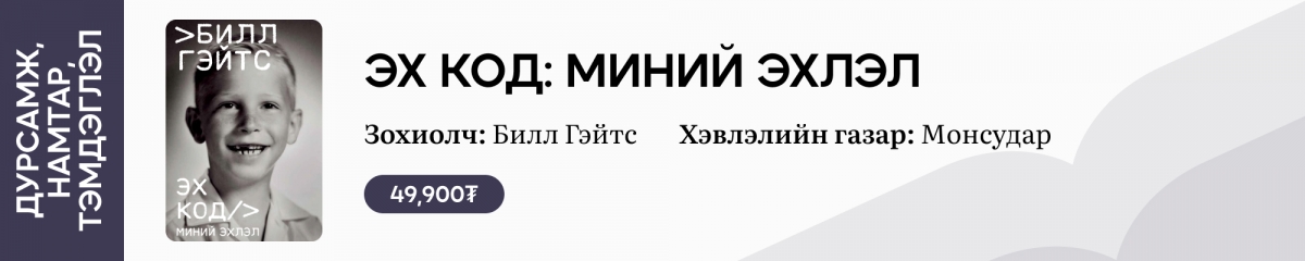 Мэдээлэл технологийн эрин зууны салхийг эрчилсэн Майкрософт (Microsoft) компанийн хамтран үүсгэн байгуулагч, гүйцэтгэх захирал асан Билл Гэйтс энэ онд 70 насыг зооглож буй. Мэргэшсэн салбараасаа гадна байгаль орчин, нийтийн эрүүл мэнд, боловсролын салбарт ч нөлөө бүхий санаачилгыг гарган ажилладаг түүний хүүхэд ахуй нас, Майкрософт компанийг үүсгэн байгуулсан он жилүүдийн тухай бид хэр ихийг мэдэх бол? “Эх код: Миний эхлэл” ном Билл Гэйтсийн хувь хүн, зан төрхийг бүтээхэд онцгой нөлөө үзүүлсэн бүхий л цаг мөч, дурсамжийн хуудсыг нямбай гэгч эргэн сөхнө.