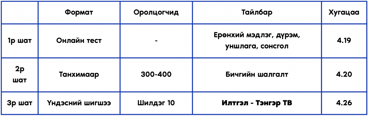 Нэгдүгээр шатнаас шалгарсан оролцогч бүрт: