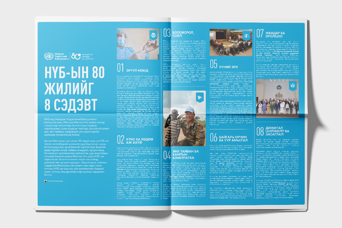 Тиймээс голын өнгөт нүүрэнд НҮБ-ын төрөлжсөн байгууллагуудын Монгол дахь бодит ажлууд, санаачилгыг тоймлон багтаалаа. Харин 10-р нүүрэнд дэлхийн өнцөг булан бүрд НҮБ-ын хэрэгжүүлсэн төслүүдийн үр дүнг сонирхолтой тоо баримтаар харуулав.