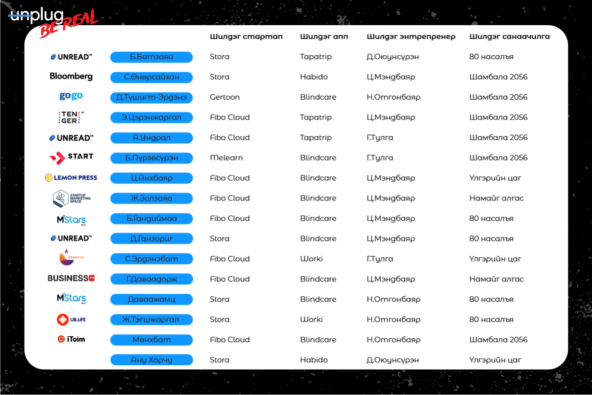 Манай тайзнаа тухайн жил "тэсрэлт" хийсэн, тод амжилт гаргасан энтрепренерүүд, байгууллагуудыг тодруулдаг уламжлалтай. Энэ жилийн "Unread Awards"-ийн ялагчдыг уламжлал ёсоор бизнес, технологийн чиглэлээр дагнан ажиллаж буй хэвлэл мэдээллийн салбарын 16 сэтгүүлч, мэргэжилтний олонхын саналаар тодруулсан юм.
