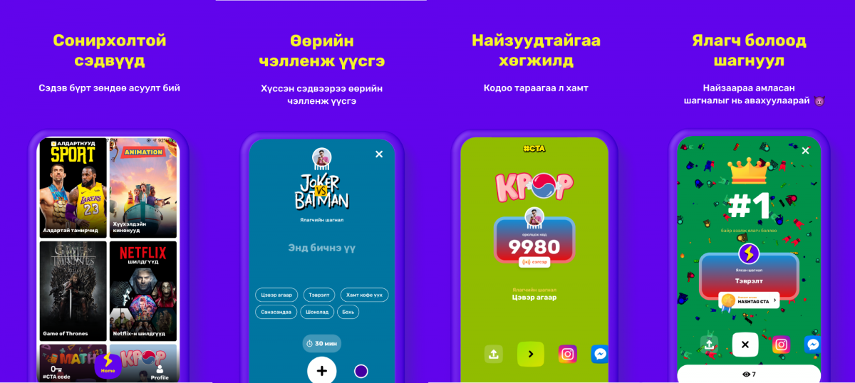 #СТА хэмээх анхаарал татахуйц нэртэй, нүдэнд тусахуйц өнгө төрхтэй апп-ыг та сошиалын хаа нэгтээ харсан л байх. Асуулт, хариултын тэмцээн дээр суурилсан энэхүү хөгжөөнт платформ гарч ирсэн цагаасаа хойш 434 өдрийн турш нэг ч өдөр алгасалгүй бэлгийн хур оруулжээ. Өнөөдөр л гэхэд тэмцээний ялагч KFC-ээс үйлчилгээ авах эрх хожих юм. Залууст эрхгүй таалагдахаар энэ талбарыг зургаан найз хамтдаа хөгжүүлдэг ба саяхан өөрсдийн бие даасан апп-тай болж үйл ажиллагаагаа улам тэлж байгаа аж.