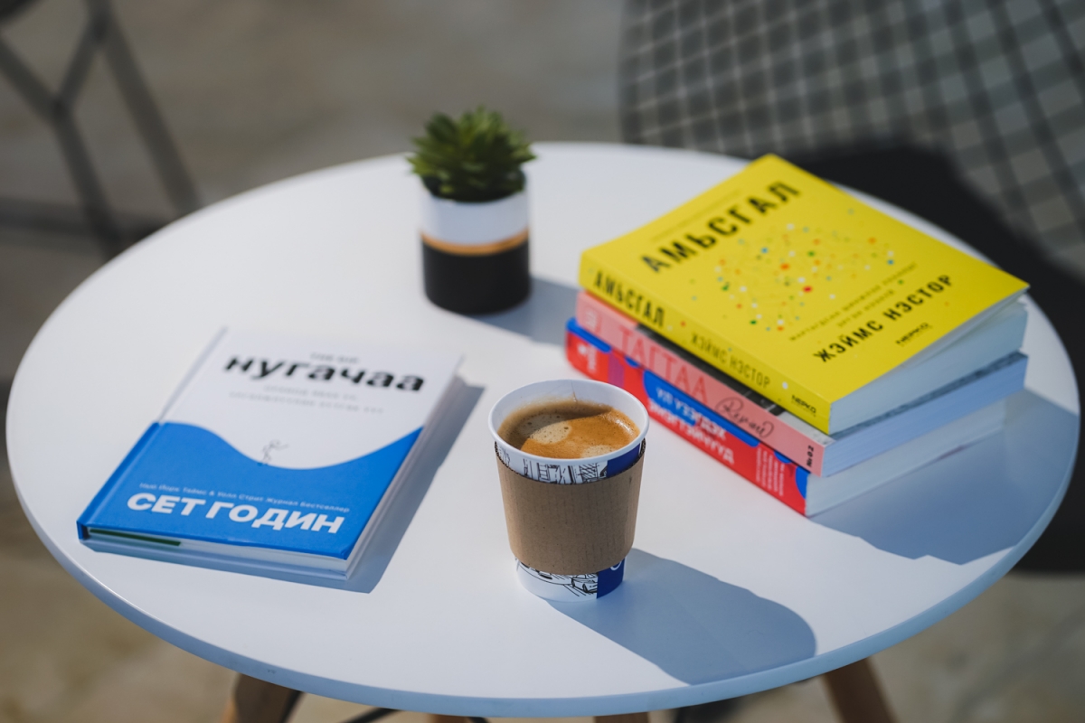 Кофены хувьд ч гэсэн сонголтыг цөөлж американо, латте гэсэн хоёр нэр төрлийн кофе л гаргаж байгаа. Зун мөстэй гаргана. Нэгэнт уламжлалт кофе шопуудтай өрсөлдөхгүй, номын дэлгүүрээ баяжуулж байгаа зүйл тул энэ хоёроо тултал нь сайн гаргах бодолтой. Сонголт ихсэх тусам сэтгэл ханамж буурдаг гэдэг дүрэм байдаг шүү дээ. Тэрийг бүх зүйлдээ ер нь шингээхийг хичээж байгаа. Тохижилт талаасаа нэлээн минимал, бага зэрэг индустриал мөртлөө тав тухтай орчин бүрдүүлэхийг хичээсэн. Үндсэн өнгө төрхөө дагаад бүх зүйл маань хар, цагаан, мөн байгалийн чулуун болон ургамлын ногоон өнгө зонхилж байгаа. Хавтсаар нь өрж буй номуудаа илүү тодруулж харуулахын тулд цав цагаанаар хана, тавиур хийсэн. Том зургаа ч тэр, жижиг деталь бүрээ л бодолцохыг хичээсэн дээ.
