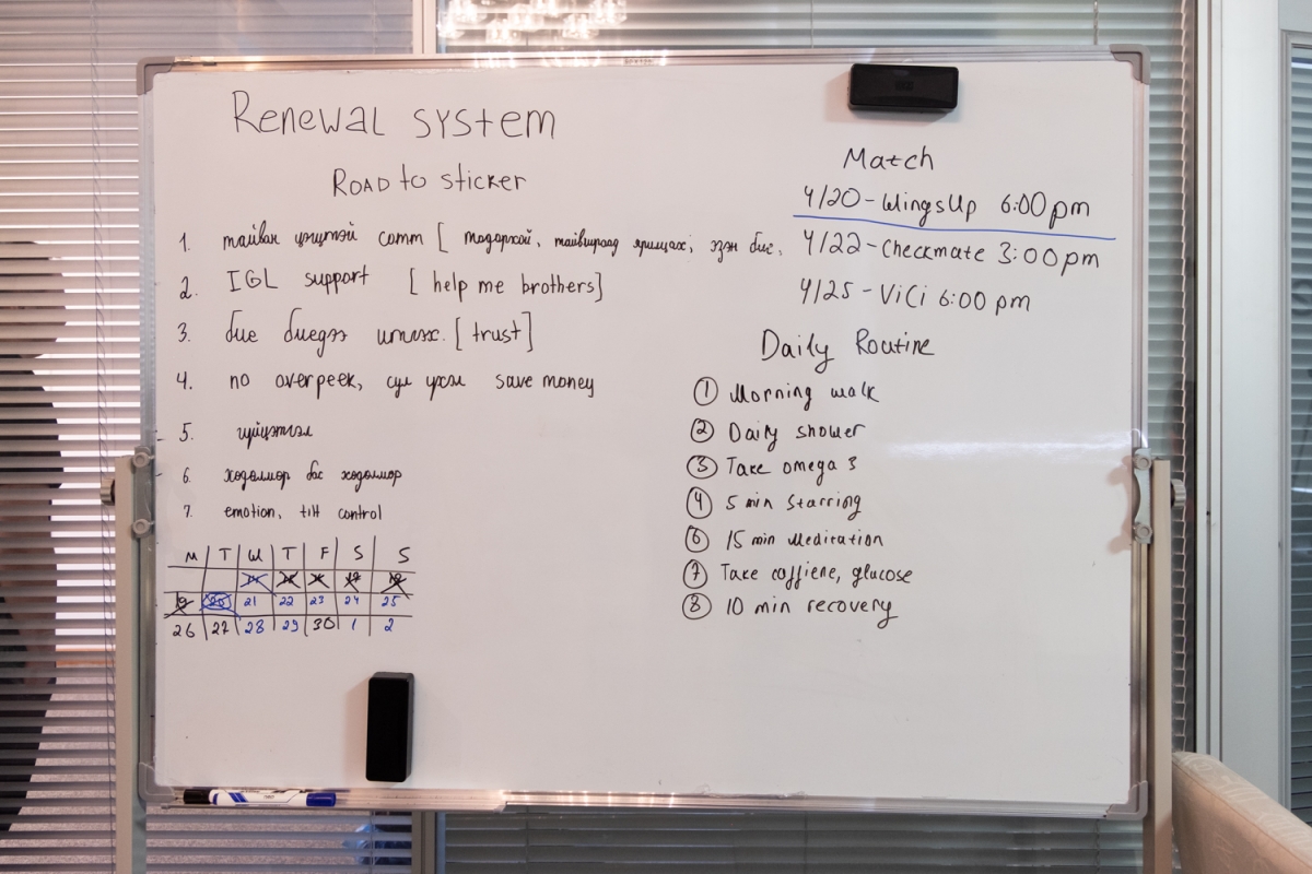 Тамирчид маань 10 цагаас 21 цаг хүртэл байнгын хуваарьтай. Өглөө сэтгэлзүйчтэйгээ ярилцаж, дасгалаа хийгээд, өдөр дасгалжуулагчийнхаа зааварчилгаа дор хувийн болон багийн бэлтгэлээ хийгээд, дараа нь гадаадын багуудтай бэлтгэл, стрийм хийнэ. Компьютерын ард олон цаг сууна гэдэг амаргүй. Бусад спортын тамирчдаас ялгаагүй биеэ хөгжүүлж, эрүүл мэнддээ анхаарах шаардлагатай. Тэгээд ч багийн спорт учраас форм жигд байхгүй бол амжилт гаргаж чадахгүй шүү дээ. Тамирчдынхаа хэлний мэдлэгийг сайжруулахаар англи, хятад хэлний хичээл заалгаж байгаа.