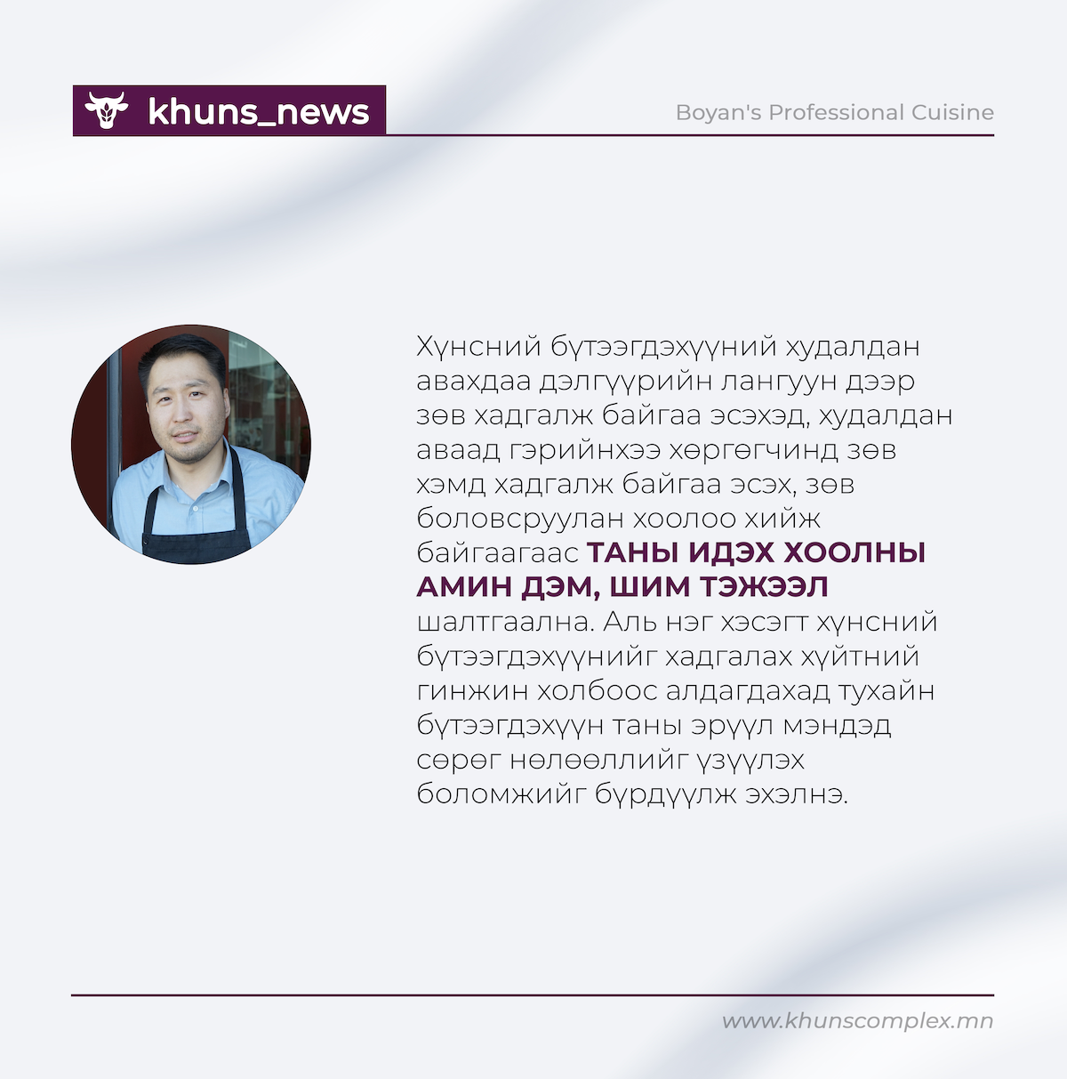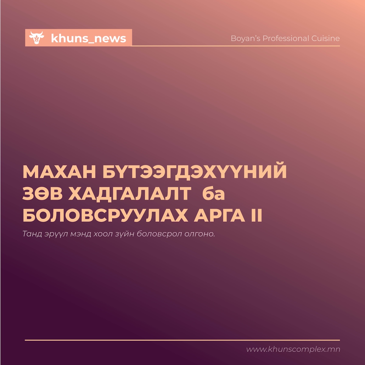 Мах, махан бүтээгдэхүүн үйлдвэрлэлийн салбар нь манай оронд сүүлийн хэдэн жил үсрэнгүй хөгжиж байна, илүү ч хөгжих потенциалтай салбар. Гол нь хөгжлийнхөө замд тогтвортой хөгжлийн зорилттой нийцэж ажиллахаа умартаж болохгүй. Ийнхүү Хүнс групп дотоодын мах, махан бүтээгдэхүүн үйлдвэрлэлийн салбартаа тогтвортой хөгжлийн зорилтыг анхлан хэрэгжүүлж эхэлсэн бөгөөд бусад үйлдвэр ч бас тогтвортой хөгжлийн зорилтуудаас өөрсдийн хэрэгжүүлэх боломжтой тодорхой хэдийг нь бага гэлтгүй үйл ажилагаандаа хэрэгжүүлж эхлээрэй хэмээн уриалж байна.