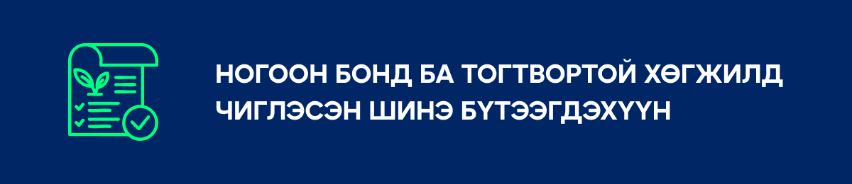 Ногоон эдийн засгийг хөгжүүлэх хүрээнд тус банкны анхны ногоон бонд болох “Ногоон ирээдүй” бондыг дотоодын биржийн бус зах зээлд гаргав. Ташрамд дурдахад, өнгөрөгч сард олон улсын зах зээлд ногоон бонд гарган санхүүжилтийн эх үүсвэр татжээ. Түүнээс гадна өнгөрөгч оны хоёрдугаар сард S&P Global байгууллагаар хөндлөнгийн үнэлгээ хийлгэж, Төрийн банкны тогтвортой санхүүжилтийн хүрээ нь олон улсын ногоон бонд, нийгмийн бонд, тогтвортой хөгжилтэй уялдсан бондын зарчим болон ногоон зээл, нийгмийн зээлийн зарчмуудтай нийцсэн, сул тал илрээгүй гэсэн дүгнэлт авчээ. Харилцагч нартаа чиглэсэн, эко тээврийн хэрэгслийн зээл, эрчим хүчний хэмнэлттэй амины орон сууцны зээл тэргүүтэй долоон төрлийн зээлийн үйлчилгээг санал болгож байгаа бөгөөд малчны ногоон зээл, оюуны хөрөнгө оруулалтын зээл, ахуйн хэрэглээний цахим ногоон зээлийг үйлчилгээндээ шинээр нэвтрүүлжээ. Үүний үр дүнд өнгөрсөн оноос ногоон зээлийн багц 108.6 хувиар, тогтвортой хөгжилд чиглэсэн зээлийн багц 92.9 хувиар өссөн үзүүлэлттэй байна.