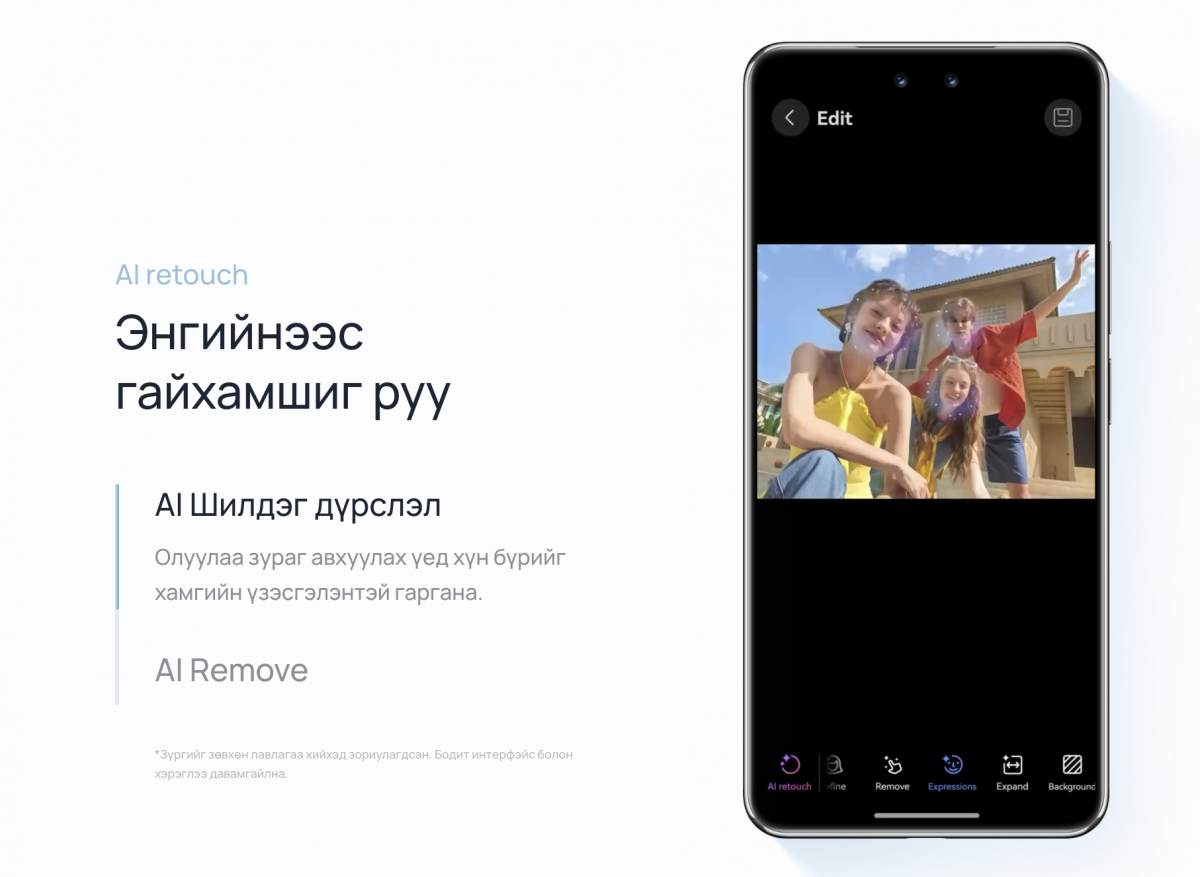 Үүгээр ч зогсохгүй хиймэл оюунд суурилсан хэд хэдэн онцлох горим бий. Тухайлбал, AI Retouch нь бүлгээр зураг авах үеийн санамсаргүй өө сэвийг бүрэн засварлах чадвартай. Зурагт орж буй хүн бүрийн царайны хувирал, нүүрний зохион байгуулалтыг таних ухаалаг системтэй тул хэдхэн даралтаар төгс зохилдлогоотой зураг бий болгоход тань тусална. Харин XD Portrait Engine горимын тусламжтай “Байгалийн,” “Нарийн,” болон “Загварлаг” горимоос сонгож, хөрөг зургаа чанаржуулах боломжтой аж.