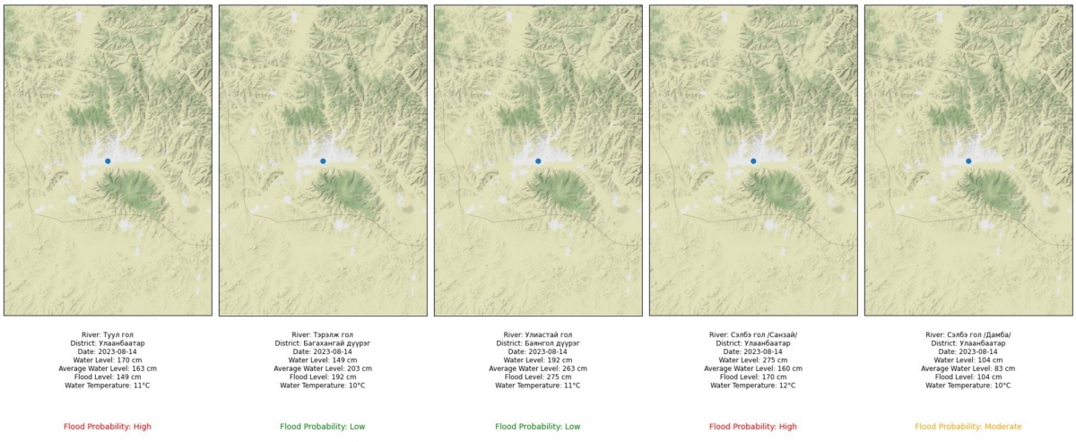 Уг ботыг уншигч та энэ холбоосоор орон дагаарай. Одоогийн хувилбарт үер болох магадлалыг мэдээлэхээс гадна Улаанбаатар хотыг дайран өнгөрдөг таван голын үерлэх магадлалыг тус бүрд нь таамаглан гаргаж байгаа юм.