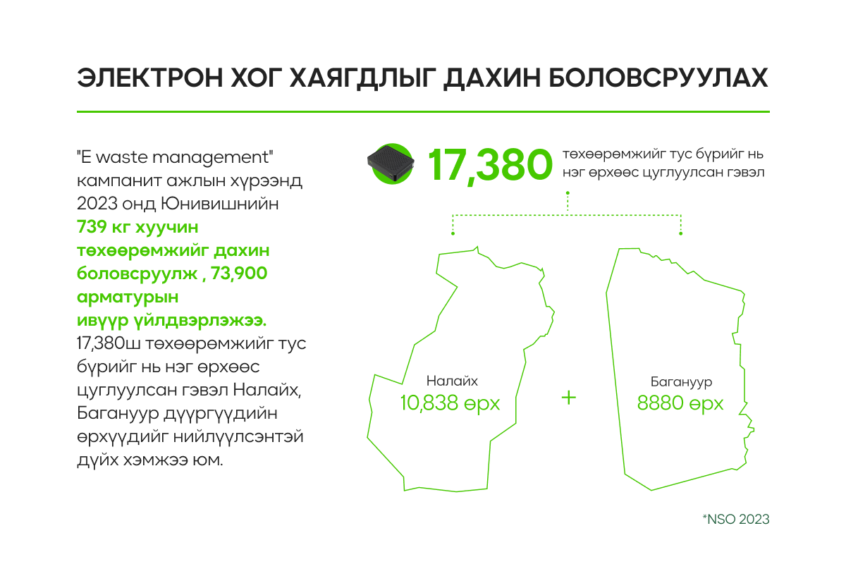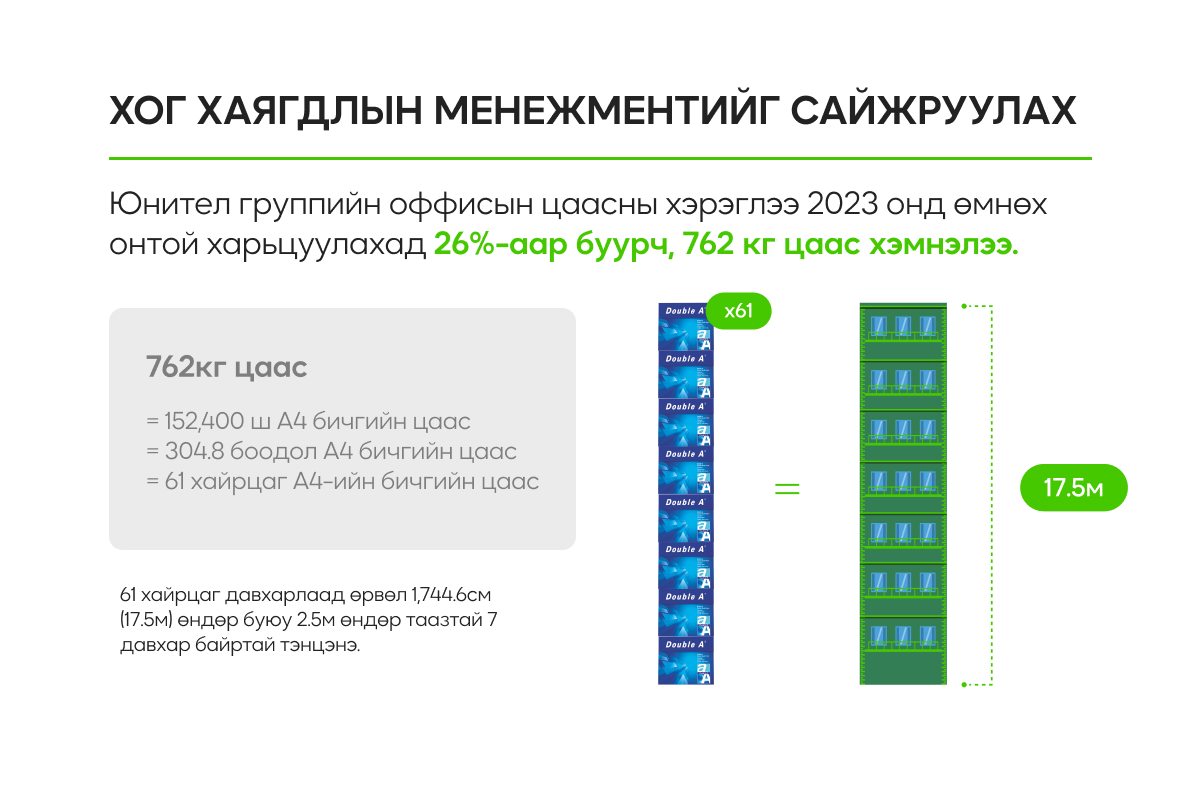 5000 кг: 2023 онд өмнөх онтой харьцуулахад нэгжийн хэвлэмэл картыг 50 хувь бууруулан, 5000 кг хаягдал үүсэхээс сэргийлсэн.