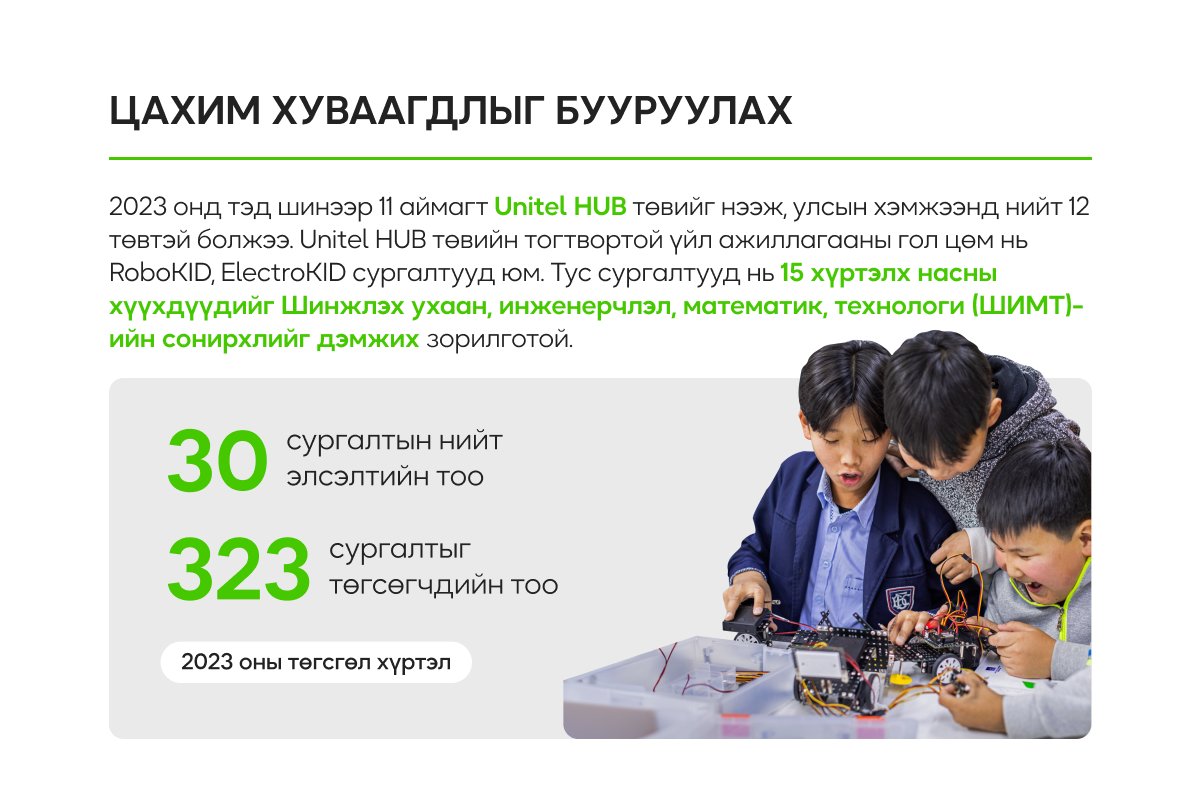 Тэд 2023 онд 11 аймагт Unitel HUB төвийг нээж, өдгөө улсын хэмжээнд нийт 12 төвтэй болоод байна. Эдгээр төвийг шаардлагатай цахим төхөөрөмж болон сургалтын материалаар бүрэн хангасан бөгөөд бэлтгэгдсэн чадварлаг багш нарын бүрэлдэхүүн тэдгээр төвүүдийг удирдан ажиллуулж буй.
