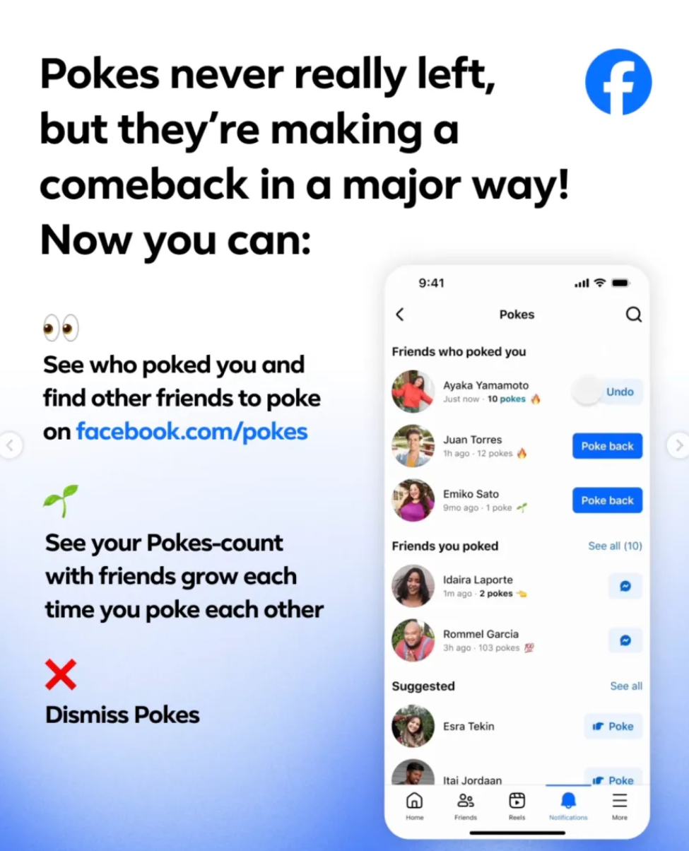 2. Facebook-ийн эхэн үеийн хамгийн алдартай үйлдэл “Poke” байсан. Уг товчийг хэрэглэгчид бие бие рүүгээ илгээж, “өдөх”, “онлайн байгаагаа мэдэгдэх”, “анхаарал татах” зэрэг олон зорилгоор ашигладаг байсан юм. Facebook-ийн хувьд хэрэглэгчид хоорондын харилцааг идэвхжүүлэх зорилгоор “Poke” товчийг эргэн авчирч байгаагаа зарлажээ. Одоо хэрэглэгчид хэн хэн, хэдэн хүн таныг "Poke" хийсэн зэрэг мэдээллийг нэгдсэн хуудаснаас харах боломжтой болсон гэнэ.
