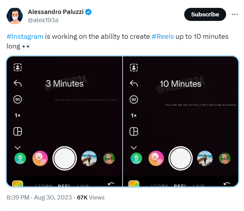 2. Instagram богино хэмжээний видео формат рийлсийн /reels/ уртыг 10 минут хүртэл сунгах туршилт хийж байна. Ингэснээр хэрэглэгчид 3 эсвэл 10 минутын уртаас сонголт хийх боломжтой болох юм. Тэдний гол өрсөлдөгч, энэ зах зээлд тэргүүлэгч TikTok-ийн хувьд төлбөр төлсөн хэрэглэгчид 20 минут хүртэлх видеог оруулах боломжтой байдаг билээ.