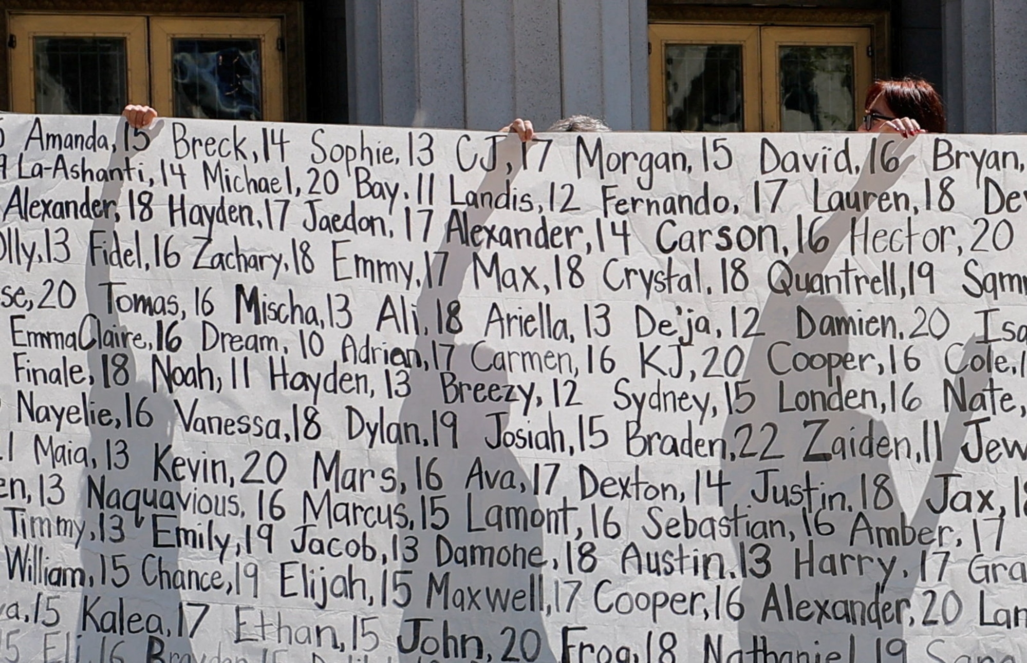 Гэрэл зургийн тайлбар: Лос Анжелесийн шүүх сошиал медиа платформуудыг хүүхэд, өсвөр үеийнхнийг хамгаалах тал дээр хангалттай арга хэмжээ аваагүй гэж үзэв. Шүүхийн гадаа сошиал донтолтоос болж амиа алдсан хүүхдүүдийн эцэг эх цугларчээ.