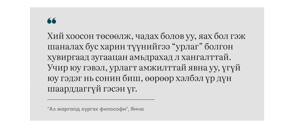 Цаашлаад бид цөхрөл, сониучирхал, шашин, гүн ухаан гээд олон зүйлсээр дамжуулан юм бүхэнд утга учир, оршихуйн шалтгааныг нь олж өгөхөөр зүтгэдэг онцлогтой төрөл. Үнэхээр ч ажил хөдөлмөр, хайр дурлал, гэр бүлийнхээ төлөө тасралтгүй зүтгэхэд тэр хэмжээний хүчтэй шалтгаан хэрэгтэй байдгийг үгүйсгэх аргагүй. Гэвч энэ мэтээр юм бүхнээс учир шалтгаан хайсаар байвал цаг хугацаа өнгөрөхийн хэрээр тэр бүхэн нуран унах нь гарцаагүй. Өөрөөр хэлбэл, хүсэж орсон ажил тань нэг л өдөр хий хоосон санагдаж, хүсэл тэмүүлэл бөхөх болно. Танил санагдаж байна уу? Улмаар өдөр бүр завгүй ажилладаг юм шиг ч цаг нөхцөөх нь их, цаг тутам инээх ч жинхэнэ баяр баясалгүй, эдэлж хэрэглэх нь их боловч амьдралын дүүрэн мэдрэмжгүй “сүүлчийн хүн” болцгоодог аж.