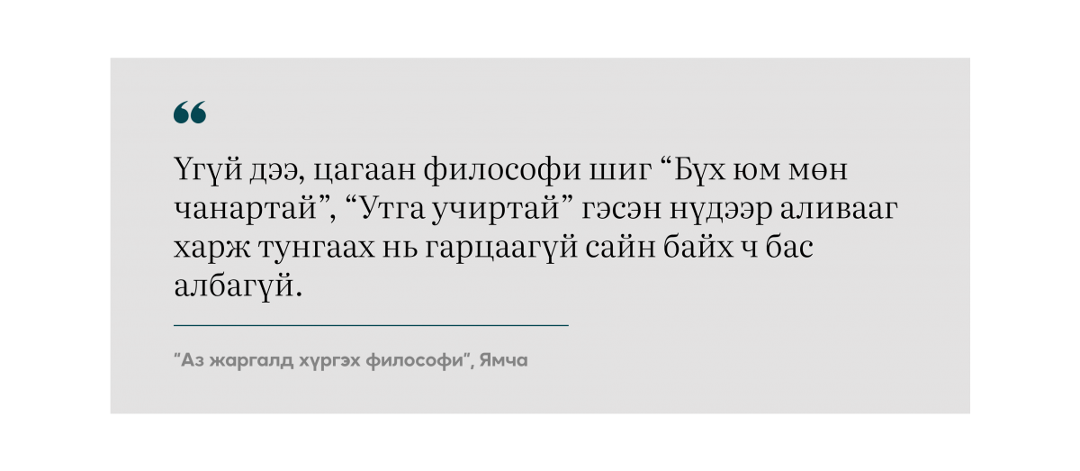 Нэгэн цагт шатан дурлаж явсан хүсэл тэмүүлэл минь хэзээнээс ч юм мөн чанараа алдаж эхлэхтэй зэрэгцэн, хэзээд өөдрөг гэгэлгэн байх аятай дэврүүн явдаг оюун санаа минь ч бас ирээдүйд хааш явж, юу хийхээ мэдэхээ больтлоо туйлдсан байлаа. Ер ийм хаалгагүй өрөөнд хашуулсан мэт тодорхойгүй үе хүн бүрд давтамжтай тохиодог болов уу. Энэ л төөрөгдмөл үеэсээ гарахаар зүтгэж, эрэл хайгуулд хатаж, эвээ олохгүй ээрч явах үедээ би ажлын ширээн дээрээсээ “Аз жаргалд хүргэх философи” хэмээх нэрийг олж харсандаа өөрийгөө азтайд тооцдог юм. Зөв цагтаа зөв зүйлтэйгээ таарсан болохоор тэр. Асуултад минь хариулт, байшинд минь хаалга болж өгсөн энэ ном уншигч танд ч бас таалагдана гэдэг үл эргэлзэнэ.