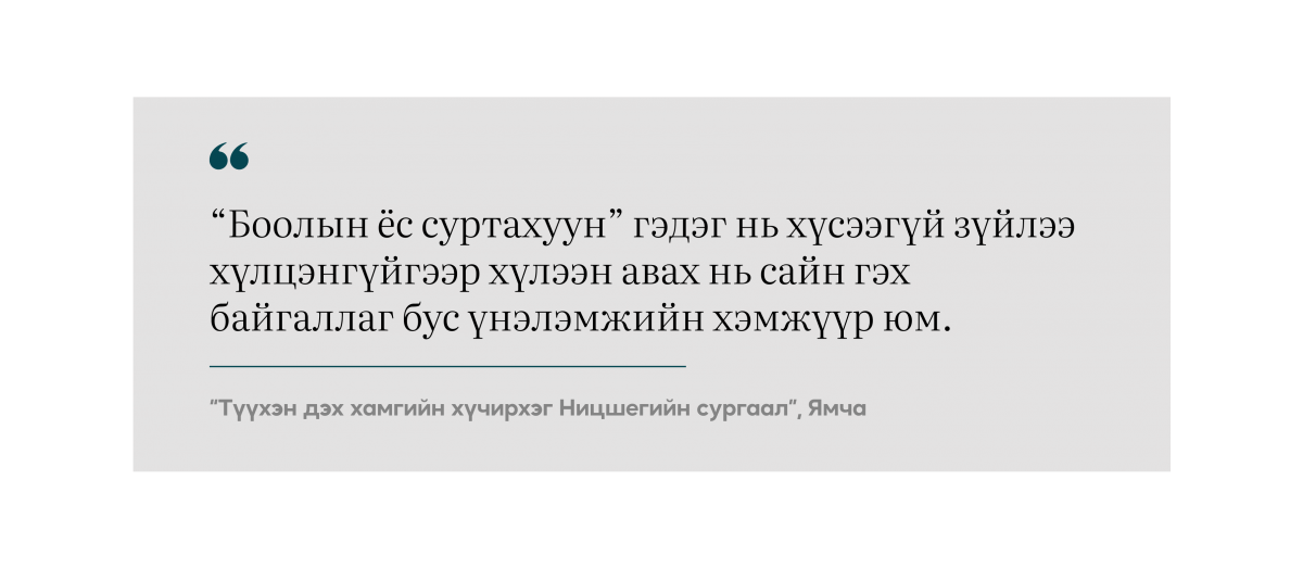 Чухамдаа компанийн боол болсноо хүлцэнгүй хүлээж авдаг, долоо хоногт олон цагаар илүү ажилласнаа наргиан болгож бахархан гайхуулдаг хүмүүс Ницшегийн үзлээр “уугуул амьдрахуйгаа дарж тэвчсэн” хуучнаар бол боолын, өнөө цагийнхаар “нийгмийн тэжээврийн ёс суртахуун”-тай хүн болж таарах нь.