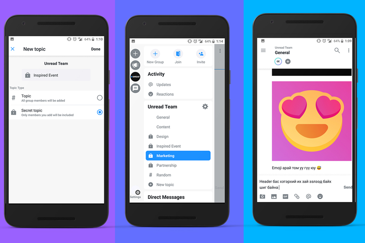 Slack-тай ижил боломжууд, Facebook Messenger-тэй төстэй эможи, хөдөлгөөнт зураг зэрэг энтертэйнмэнт төрлийн боломжуудыг шигтгэж өгснөөрөө онцлогтой. Сэдэв үүсгэх, группийн гишүүд рүү тусгайлан мэссэж бичих, группд харьяалагдаж буй хүмүүсийг аль сэдэв руу орохыг зааж өгөх зэрэг боломжуудаараа бусад багийн ажиллагааны чат аппуудтай ижил.