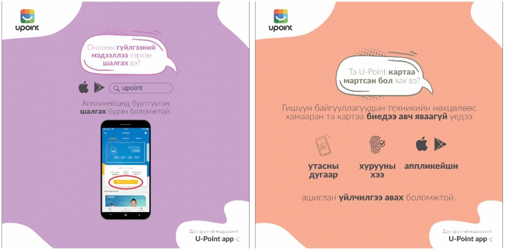 2. Техник технологи хөгжсөн энэ цаг үед хөнгөлөлтийн олон карт авч явах хэрэггүй болжээ. Хэрэглэгчид хамгийн өргөнөөр үйлчлүүлдэг байгууллагуудынхаа лояалти оноог U-Point аппликейшнийг ашиглан удирдах, захиран зарцуулах, хянах боломжтой юм. Танд юм уу ойр дотнын хэн нэгэнд тань худалдан авалт хийх, хөнгөлөлт эдлэхэд оноо дутсан тохиолдолд оноогоо шилжүүлэх, бусдаас шилжүүлэн авч болдог нь онцлууштай.