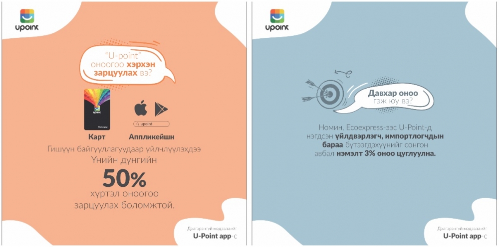 1. Нэгдсэн хөтөлбөр гэдэг утгаараа аппликейшнээс гадна өөрийн гэсэн карттай. Ингэснээр интернетгүй, ухаалаг утасгүй байсан ч та үйлчилгээ авах боломжтой гэсэн үг юм. Хийсэн худалдан авалтынхаа 3-10 хүртэлх хувийг оноо болгон буцаан авч, хуримтлуулж болох бөгөөд оноогоо ашиглан 50 хүртэлх хувийн хөнгөлөлт эдэлж болно. Оноогоо хасуулаад худалдан авалт хийсэн ч бонус оноо ордог нь тун ашигтай. 1 U-Point оноо 1 төгрөгтэй тэнцүү аж.
